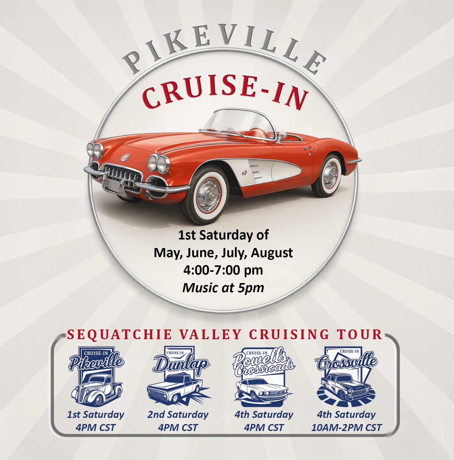 Get ready for an unforgettable journey through the Sequatchie Valley, where history, community, and classic cars come together! The Cruising Tour takes you through the charming towns of Pikeville, Dunlap, Crossroads, and Crossville, each brimming with vintage character and timeless appeal. Along the way, you’ll uncover hidden treasures nestled between the mountains, enjoy scenic drives past rustic barns, and savor meals at local restaurants that celebrate the valley’s heritage. But the adventure doesn’t end there—every stop brings you closer to the Grand Finale Celebration in Dunlap!